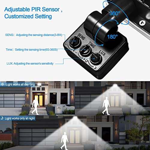 ▶【Tre impostazioni del sensore】: Il Faretto LED con Rilevatore di Movimento esterno ha la modalità TIME, la modalità SENS e la modalità LUX. LUX viene utilizzato per impostare l'orario di lavoro durante il giorno o la notte. Il tempo di ritardo del sensore viene impostato con TIME. (10-180 s) SENS viene utilizzato per impostare la sensibilità del sensore.