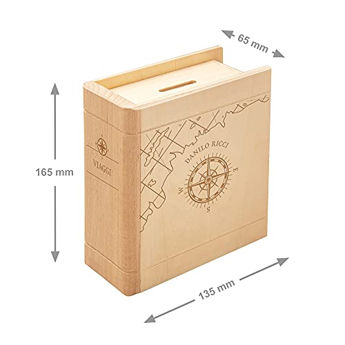 Casa Vivente Salvadanaio a Libro in Legno, Incisione Personalizzata con Nome, Motivo Bussola, Risparmi per i Viaggi, Fondo Vacanze