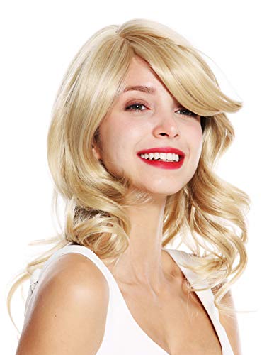Splendida parrucca da donna con un look vagamente retrò anni 80. I capelli con rigogliose onde sono biondo oro con riga carina. Sembra proprio una parrucca da diva.