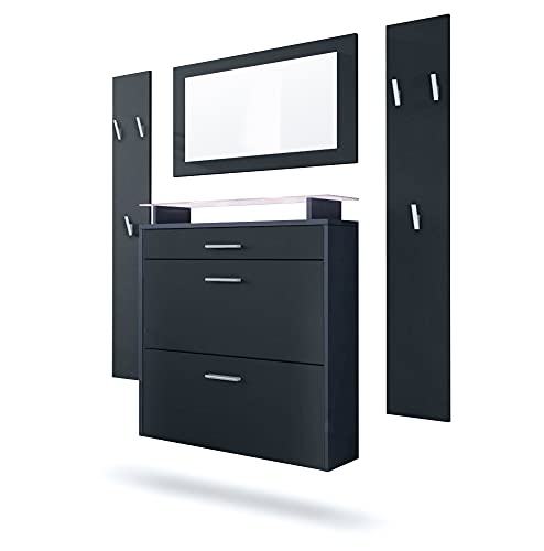 Vladon Malea Hallway Storage Set, Set da ingresso con 1 scarpiera a muro, 1 specchio a muro e 2 pannelli appendiabiti, antracite/nero opaco