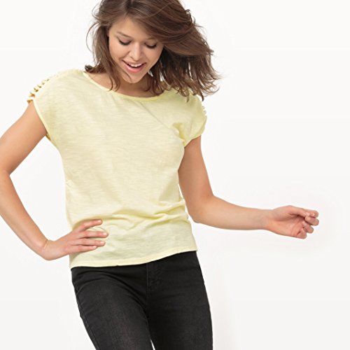 La maglietta a maniche corte con scollo rotondo è realizzata in puro cotone. I dettagli sulle spalle non passano inosservati.