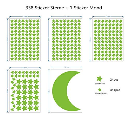 Voarge 339 adesivi da parete con punti luminosi, autoadesivi, fluorescenti per il tuo cielo stellato, stelle luminose, per la cameretta dei bambini (338 stelle + 1 luna)