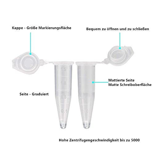 Attrezzatura da laboratorio necessaria: capacità: 1,5 ml. Diametro: 10,6 mm. Lunghezza: 41 mm. Area smerigliata sul cappuccio e sul tubo per etichettatura e commento. I tubi di centrifuga sono uno degli strumenti più comuni in laboratorio. Sono utilizzati per separare o trattare liquidi chimici e altri componenti. Sono uno degli strumenti più utilizzati in laboratorio.