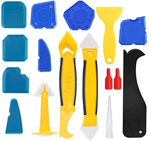 16 strumenti in silicone per calafateo per calafateo contiene 8 strumenti di finitura in silicone, 1 strumento di finitura giallo, 1 raschietto per boiacca in plastica gialla, 1 raschietto in plastica giallo, 1 ugello giallo per mastice, 1 strumento per la rimozione dello stucco nero, 1 ugello per mastice e 2 tappi per mastice