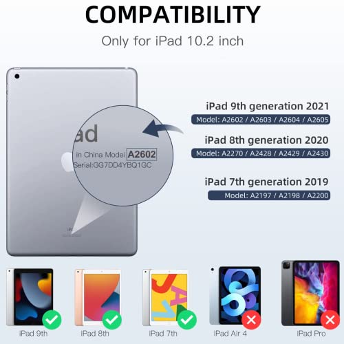 [Compatibilità] Questa custodia è specificamente progettata per Apple iPad 9a 8a 7a generazione da 10,2 pollici (modelli iPad 2021 2020 2019: A2602 / A2603 / A2604 / A2605 / A2270 / A2428 / A2429 / A2430 / A2197 / A2198 / A2200). Si noti che non è compatibile con altri modelli di tablet