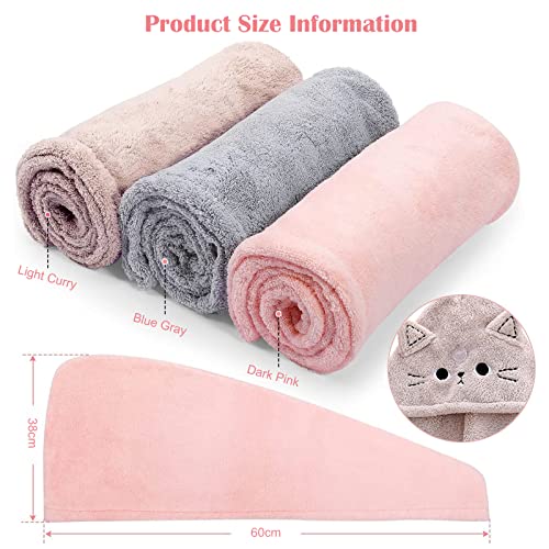 VOHESEA Turbante per capelli, 3 pezzi, in pile corallo, turbante per capelli, asciugamano a ventosa, per donne, ragazze, bambini, tutti i tipi di capelli, 38 x 60 cm, rosa scuro+curry chiaro+blu