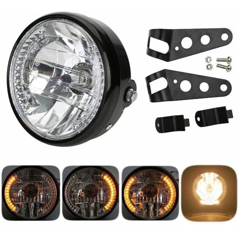 Nome del prodotto: faro anteriore Halley modificato da 7 pollici + staffa del faro Peso del prodotto: 0,76 g Colore del prodotto: nero, superficie trasparente trasparente Colore indicatore: giallo 2000K;