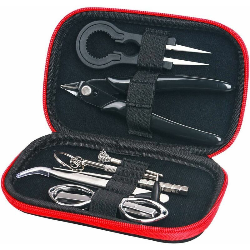 Set di strumenti 9 in 1 - Include forbici pieghevoli, spirale, pinzette curve, pinzette in ceramica 2 in 1, spazzola in acciaio inossidabile, cacciavite a T, taglierine laterali, pinzette in ceramica 2 in 1, set di strumenti con custodia portatile Pinza a gomito, spazzola a spirale e forbici pieghevoli, realizzate in acciaio inossidabile di alta qualità. Regola il cotone, pulisci le bobine, il cotone e i residui liquidi. La lama della forbice può essere piegata con grande sicurezza Pinzette e tagliafili in ceramica - Per svitare la base dell'evaporatore, rimuovere le teste dell'evaporatore e i fili incandescenti. Il tagliafili taglia solo alcune bobine, non il filo d'acciaio Chiusura a doppia cerniera - Cerniera a due vie per un facile accesso, chiusura sicura quando non in uso. 39;