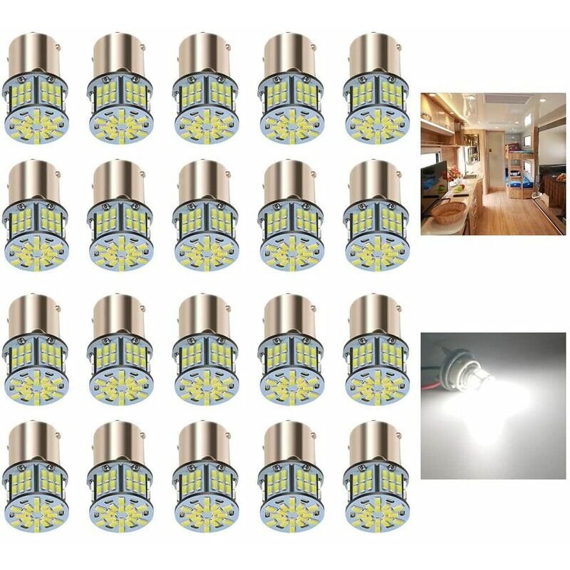 Adattabilità universale < p> (Confezione da 20 lampadine) 54 chip SMD 3014 ad alta luminosità per lampadina, Tensione di funzionamento: solo per veicoli con sistema a 12 V. 1159 1195 1259 1295 1295na 1459 1619 1651 1680 2396 3496 3497 7506 7527 5007 5008 1208888 luci posteriori, luci freno luci di retromarcia, indicatori di direzione, luci di posizione laterali, fanale posteriore, luce stop, luci di retromarcia e luci camper Vantaggio: oltre il 300% più luminoso rispetto alla lampadina alogena originale, maggiore durata e minore consumo energetico.