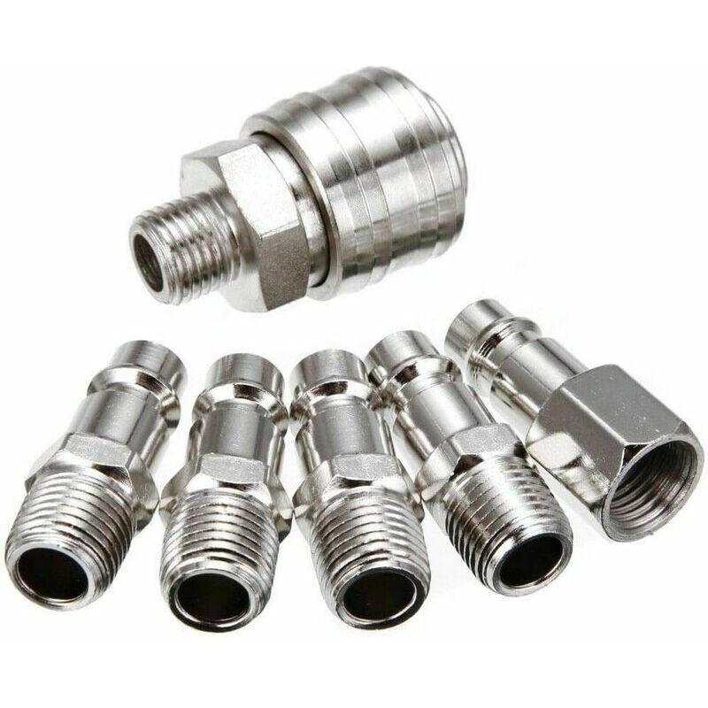 Dimensioni: 6 pezzi Caratteristiche: Kit di avviamento ideale di raccordi a sgancio rapido. Realizzato in acciaio temprato trattato termicamente per resistenza e durata. Finitura zincata per resistenza alla ruggine e alla corrosione. Gli accoppiatori a molla a sgancio rapido per l'uso lato compressore hanno una valvola incorporata per chiudere l'aria quando si cambia un utensile. Semplice da usare, basta far scorrere indietro il collare e inserire il raccordo, quindi far scorrere il collare completamente indietro per bloccarlo in posizione. Consente di connettere/disconnettere rapidamente strumenti e compagnie aeree. Il raccordo femmina ha una valvola all'interno per impedire all'aria di fuoriuscire durante il cambio dell'utensile Caratteristiche: Filettatura a sgancio rapido: 6,35 mm BSP. Modello connettore: Euro. Resistenza alla temperatura: -20-107°C. Tensione di tenuta: 150 MPa Contenuto: 1 raccordo femmina a sgancio rapido con filettatura maschio BSP da 0,6 cm. 4 raccordi maschio