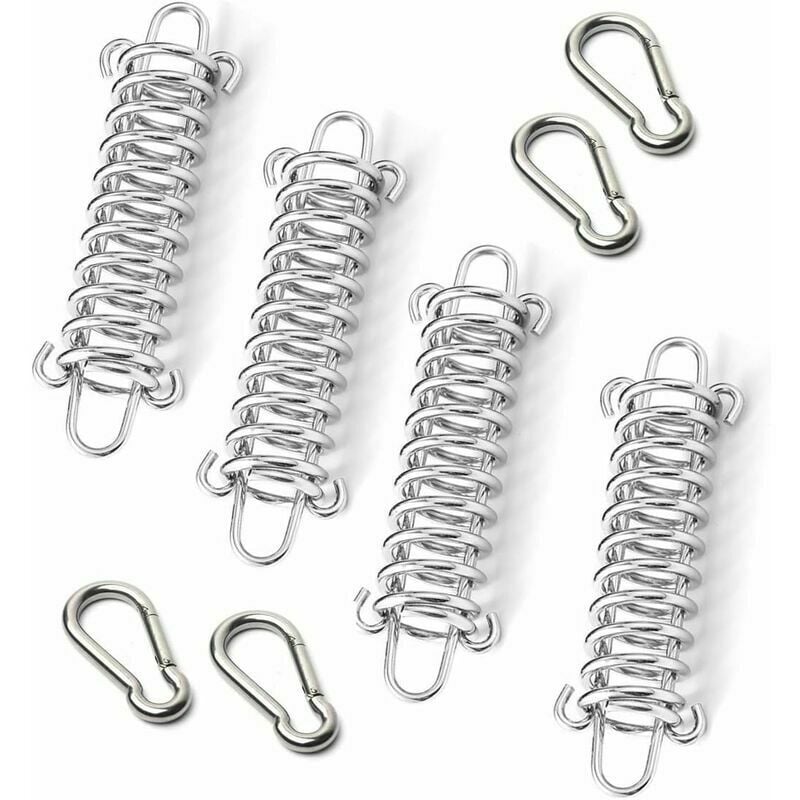 Materiale premium: le fibbie a molla della tenda sono realizzate in acciaio inossidabile, robuste e durevoli, non facili da invecchiare e arrugginire, con lavorazione artigianale di alta qualità, possono durare a lungo. Forte elasticità: il gancio di estensione della bobina di tensione è molto resistente e forte elasticità.Non si deforma e non è facile da distruggere con un'elevata resistenza alla trazione.Con 4 moschettoni in acciaio inossidabile, più sicuri e più convenienti. Facile da installare e smontare: questa fibbia a molla ha una combinazione di una molla e due ganci a forma di U, che possono essere rimossi e installati liberamente. Ampia applicazione: il tenditore per tende da sole è perfetto per campeggio, viaggi, picnic, spiagge, escursioni, caccia, pesca, tende, tende da sole, ecc. Mantieni la tua sicurezza quando esci.