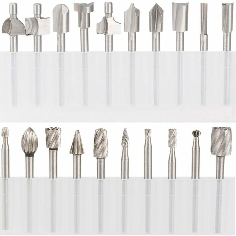 Punte per incisione in carburo di titanio HSS 10 pezzi dei tipi più comunemente usati di punte per router, diritte, a tazza, con scanalatura a V, a perline, a baionetta, a fessura, ecc. Dimensioni Diametro albero: 3 mm (1/8") Lunghezza: 1-1/2'' (39mm) Analisi dettagliata Realizzato in acciaio ad alta velocità di alta qualità per una lunga durata con rivestimento in titanio, elevata durezza, senza attrito, senza scheggiature, senza sbiadimento Punte per router HSS Può incidere su una varietà di materiali tra cui legno, ABS, acrilico, PVC, plastica, ecc. Dimensioni Diametro del #39;
