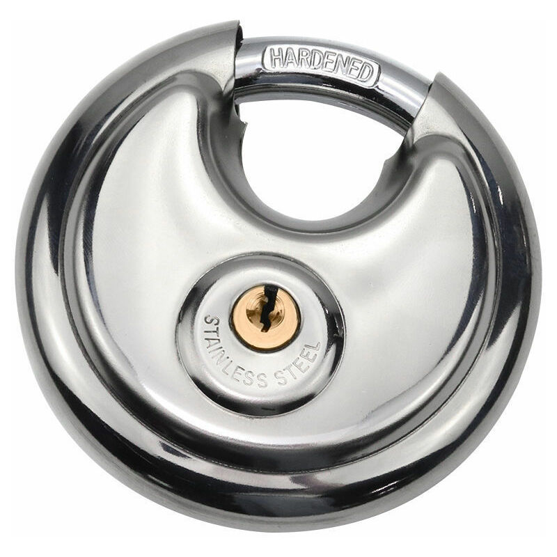 Lucchetto circolare in acciaio inossidabile 70mm Realizzato in robusto acciaio inossidabile Arco in acciaio temprato Cilindro in ottone > Include 2 chiavi Diametro grillo: 9,5 mm
