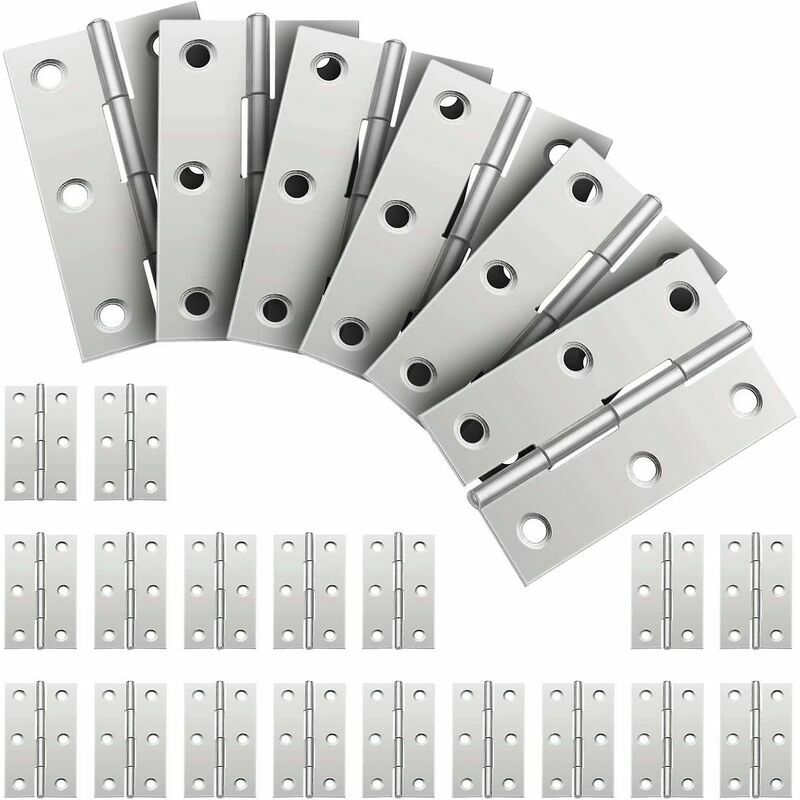 Descrizione del prodotto Argento. Materiale: acciaio inossidabile. Dimensioni: 44*31*1.0 mm Peso: 10 g/pezzo La confezione include un 24* cerniera 1.Design con 6 fori di montaggio: cerniera in acciaio inossidabile da 24 pezzi, cerniere in acciaio inossidabile con foro di posizionamento scientifico e asse stabile, che possono bilanciare il peso e ridurre il rumore, funzionare senza intoppi. 2.Realizzato in acciaio inossidabile di alta qualità: il la cerniera è realizzata in acciaio inossidabile di alta qualità, il materiale è resistente e durevole. Le cerniere in acciaio inossidabile sono resistenti all'umidità e all'umidità;