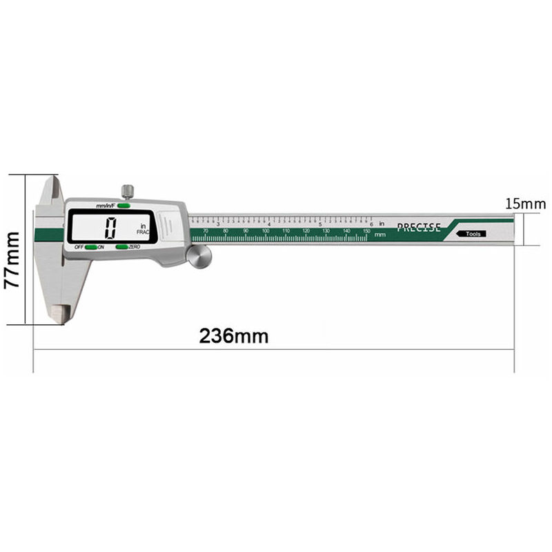 Il calibro elettronico con display digitale ti consente di misurare con precisione gli oggetti della tua vita con una semplice operazione. Allo stesso tempo, puoi leggere i dati di misurazione in tempo reale sullo schermo. I valori misurati possono anche essere convertiti tra pollici, millimetri e frazioni. Caratteristiche: Realizzato in acciaio inossidabile, pratico, resistente all'usura e non arrugginisce. Il digitale Lo schermo può visualizzare il risultato della misurazione con il tempo letto e i valori misurati possono essere convertiti tra pollici, millimetri e frazioni.L'operazione è semplice e le gambe della sella sono solide e resistenti.interruttore di alimentazione (ON/OFF ), interruttore di calibrazione zero, pollici, millimetri e interruttore di conversione frazionaria. Il campo di misurazione è 0-150 mm, la risoluzione è 0,01 mm. Specifiche: Materiale: acciaio inossidabile Colore: argento + verde Intervallo di misurazione: 0-150 mm / 0-6,0 pollici Risoluzione: 0,01 mm