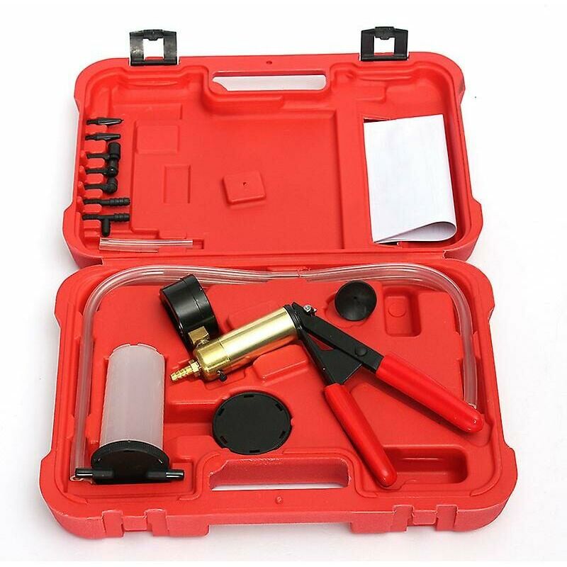 Spurgo freni e tester pompa a vuoto: kit di attrezzi 2 in 1 per spurgo freni e tester pompa a vuoto con serbatoio del liquido dei freni. Conveniente e adatto a quasi tutte le auto per ridurre al minimo i danni. TRE DIVERSE LUNGHEZZE DEI TUBI: 3 diverse lunghezze dei tubi per soddisfare le diverse esigenze con diversi adattatori per adattarsi alla maggior parte dei tipi di veicoli. Multi- funzione: parametri di base del veicolo e funzioni di controllo dei componenti nel sistema del vuoto, come sensori MAP, valvole, tubi flessibili, ecc. Manometro accurato: 0-30inHg, 760mmHg. Adatto per applicazioni domestiche e professionali, anche per impianti freno e frizione. Manometro a doppia scala: pompa a mano con manometro a doppia scala di facile lettura. Bella custodia per il trasporto e lo stoccaggio facili.