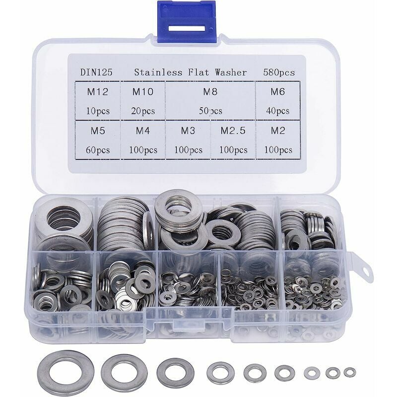 Confezione da 580 rondelle in acciaio inossidabile (9 dimensioni) Hai una persona cara a cui potrebbe piacere questo set? Perché non regalare questo set per compleanni o altre occasioni? Ti ringrazieranno per questa attenzione. Le nostre rondelle di bloccaggio sono perfette per la casa, i meccanici o i negozi di ferramenta. Con una scatola di plastica, è facile ordinare queste rondelle piatte per dimensione e trovare quelle che ti servono. Questo kit contiene:- Il nostro set include M2 X 100pz, M2.5 X 100pz, M3 X 100pz, M4 X 100pz, M5 X 60pz, M6 X 40pz, M8 X 50pz, M10 X 20 e M12 X 10pz Dimensioni:- Ogni set di rondelle metalliche ha 9 diverse dimensioni, M2: 0,5 cm, M2.5: 0,5 cm, M3: 0,7 cm, M4: 0,9 cm, M5: 1 cm, M6: 1,15 cm, M8: 1,5 cm, M10: 1,9 cm, M12: 2,3 cm.