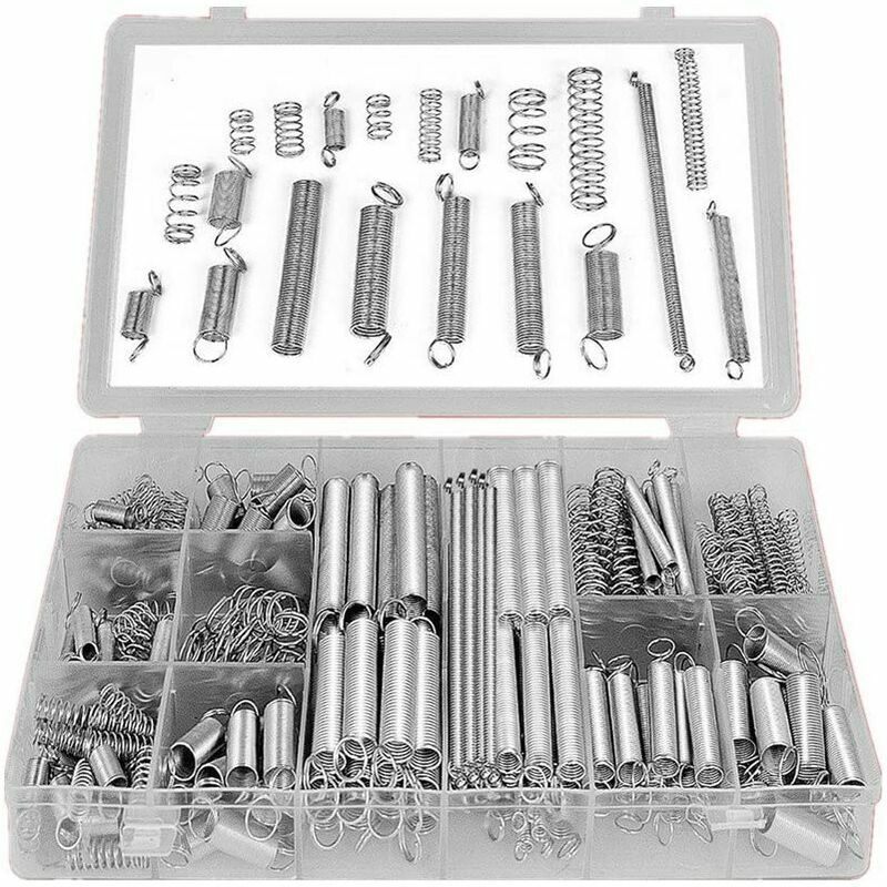 Caratteristiche - Materiale: acciaio zincato. - Dimensioni: diametro 4 - 9,5 mm / 0,16-0,37 pollici. - Lunghezza 10 - 79,5 mm/0,39 - 3,13 pollici. - Grande resilienza e per un uso duraturo. - Maggiore resistenza alla corrosione. - Utilizzato per motori automobilistici, grandi elettrodomestici, dispositivi medici, elettronica e strumenti di misurazione sensibili. Pacchetto comprensivo di scatola di molle di estensione e compressione Assortimento di molle - 200 pezzi