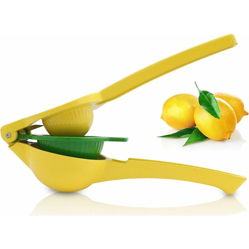 SUCCO E LIMONATE SANI FATTI RAPIDAMENTE: Lo spremiagrumi manuale per lime, limoni e arance ti offre una vita più sana, ogni giorno, semplicemente. Una limonata fresca d'estate, un pesce condito con succo di lime o un bicchiere di succo d'arancia a colazione, tutto è pronto in un minuto. La noiosa pulizia degli spremiagrumi elettrici è finita. FACILE DA MANEGGIARE: senza troppi sforzi, i manici possono essere stretti insieme. La spremitura degli agrumi diventa un gioco da ragazzi. La pressa manuale è facile da pulire e lavabile in lavastoviglie. IMPORTANTE: Gli agrumi vengono posizionati capovolti, tagliati verso il basso verso i fori di estrazione (vedi foto). DESIGN PRATICO: I 7 fori consentono al succo di fluire liberamente mentre vengono trattenuti solo i semi e la polpa . Smaltato in giallo e verde fresco e brillante, questo bellissimo utensile da cucina è un regalo ideale per i cuochi casalinghi, come regalo di Natale, regalo di nozze o per i genitori che spremono succhi salutari