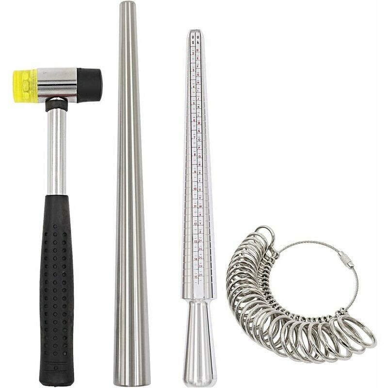 Molto comodo per misurare rapidamente le dimensioni degli anelli e Kit di strumenti essenziali e pratici per professionisti e principianti per lavorare fili metallici e fili metallici per gioielli. Le misure sul triboulet in alluminio, conformi agli standard statunitensi e britannici, sono facili da leggere per taglie intere e mezze taglie. Set di 27 anelli in acciaio, misura USA (0-13) consegnati in mezze dimensioni su un cavo flessibile Dotato di una comoda chiusura a vite. Le due estremità in gomma del martello vengono utilizzate per levigare o rinforzare i fili, non lasciare tracce sui gioielli e non danneggiarli. Il mandrino molto resistente e il martello rendono facile arrotondare gli anelli. Perfetto per modellare gli anelli. Mantiene perfettamente la forma, facile da maneggiare.