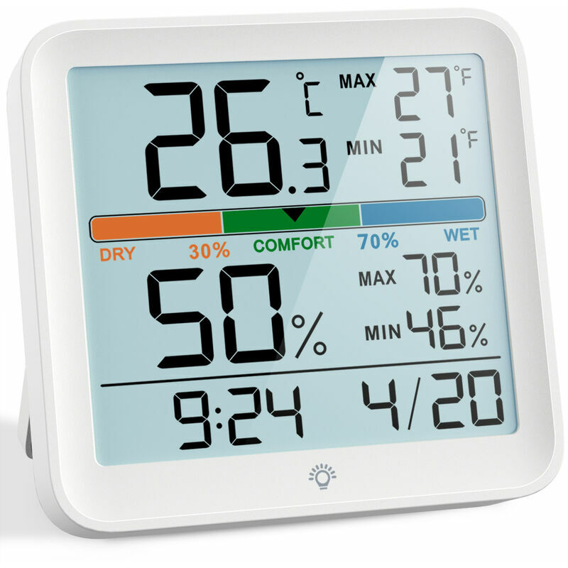 misurazione dell'umidità 10% RH ~ 99% RH, Precisione: 30% ~ 80% ± 2%, oltre questo intervallo, la precisione dell'umidità è ± 3%. Questo termometro per interni a grande schermo presenta 27 prese d'aria e un trasmettitore sensibile che aggiorna le letture in 3 secondi. Adatto per camere da letto, asili nido, serre, uffici e cantine. [Retroilluminazione touch e ampio schermo] Questo termometro per il monitoraggio della temperatura ambiente ha un ampio schermo da 3,05 pollici, che è più facile leggere da qualsiasi angolazione e da una lunga distanza. Inoltre, questo igrometro ha una retroilluminazione touch. Toccare la parte superiore per accendere/spegnere la retroilluminazione, si spegnerà automaticamente dopo 10 secondi. Questa caratteristica rende questo termometro ambientale