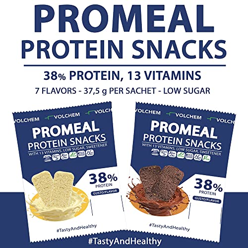 Volchem Promeal Protein Snacks 38, Snack Proteico al 38% di Proteine, con Vitamine, Senza Grassi Idrogenati, Conservanti e con Pochi Zuccheri, Scatola da 16 Bustine, Gusto Cacao, 600 g