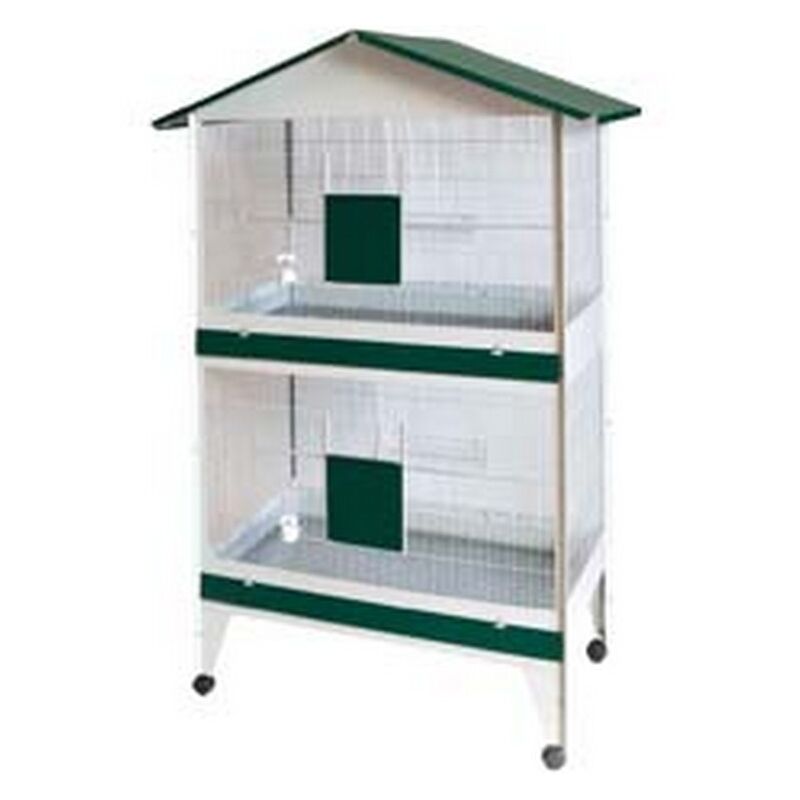 Tetto a casetta, divisorio centrale rimuovibile - costruita con materiali interamente zincati, adatta per volatili di diverse specie - cassetti estraibili per una comoda pulizia - la voliera pu? diventare anche unica togliendo il lamierino centrale che la
