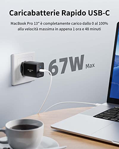 VOLOHAS USB C Caricatore da 67W a 2 Porte GaN Charger PD3.0 Mini Alimentatore di Rete per DJI Mini 4 Pro/Osmo Action 3 per Apple Watch/Homepod 2/Galaxy S22/S21/Google Pixelbook/Steam Deck(Nero)