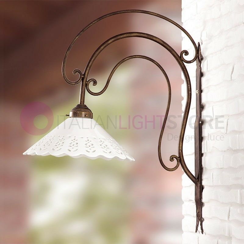 Lampadario da parete in ferro forgiato e diffusore in ceramica bianca traforata. Lampada da parete applique con struttura in ferro battuto e diffusore in ceramica in stile classico rustico country, collezione Volterra di Ceramiche Borso . La lampada ha diffusore in ceramica bianca lucida traforata a forma di cono smerlato;