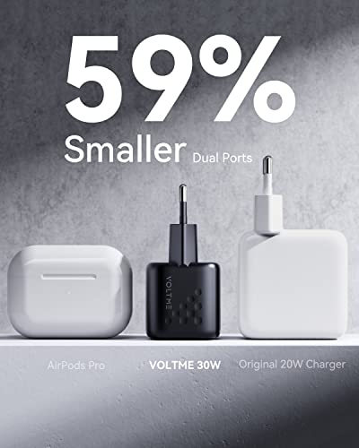 VOLTME Caricatore USB C 30W 2-Porte Rapido Nero, Caricatore Doppio USB-C 30W Doppia Ricarica GaN PD3.0 & PPS Presa USB C Compatto e Compatibile con iPhone 14/13/12, Samsung, iPad, MacBook Air