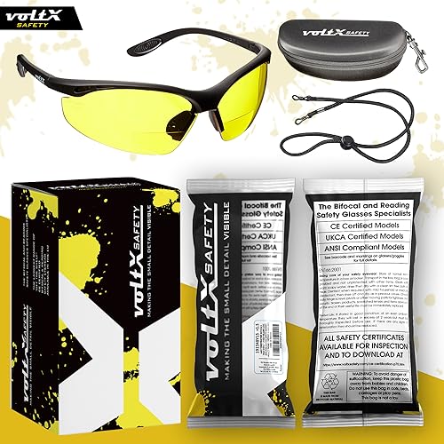VoltX 'CONSTRUCTOR' Occhiali di sicurezza da lettura BIFOCALI (GIALLI +1,5 diottrie) con certificazione CE EN166F/Occhiali da ciclismo cordino di sicurezza incluso + astuccio rigido a forma di conchiglia