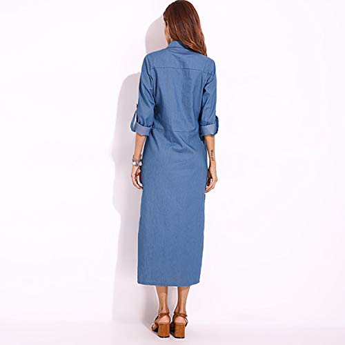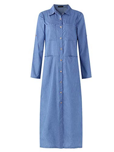 VONDA Abito camicia da donna abbottonata maxi abiti arrotolabili manica lunga casual con tasche, Blu denim chiaro., XXXXL