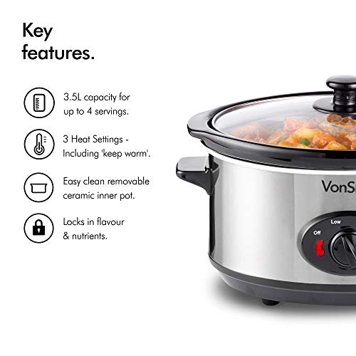 VonShef Pentola per Cottura Lenta in acciaio inox da 3,5L con contenitore rimovibile da usare come piatto di portata e coperchio in vetro temperato