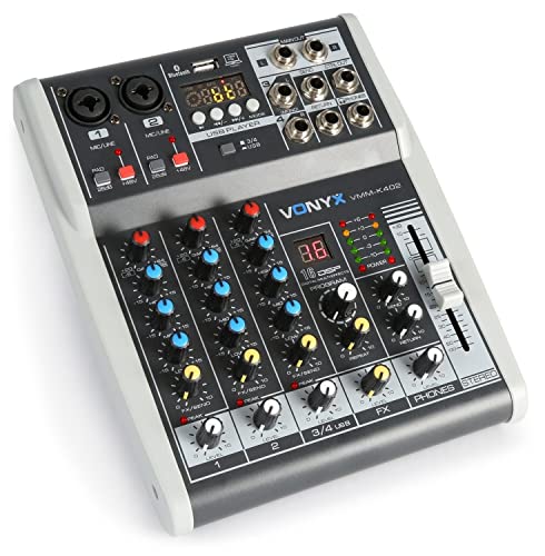 Vonyx VMM-K402 - Music Mixer 4 Canali, Bluetooth, USB-Audio-Interface, LED VU Meter e Peak LED, Uscita cuffie, 2 x ingressi Mono Microfono/Line (Combo XLR/jack da 6,3 mm)