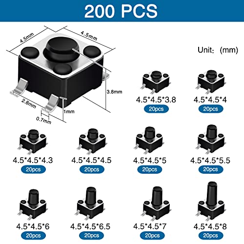 VooGenzek 200 Pezzi 10 Valori Tattile Interruttore di Pulsante Kit, 4.5*4.5mm Micro Momentaneo Tatto Assortimento Kit, Nero