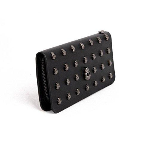 VORCOOL Pochette-portafoglio con chiusura lampo, con rivetti a forma di teschio, articolo in finta pelle, colore: Nero