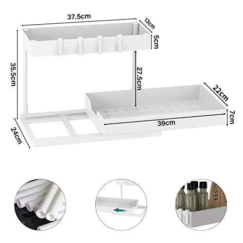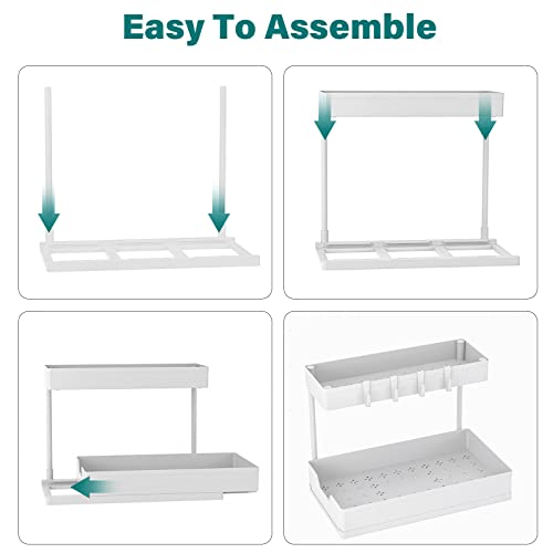 VORHOT Organizzatore Sotto il Lavandino 2 Livelli, Scorrevole Scaffale Sottolavello Portaoggetti con 4 Ganci, Estraibile Cassetti Organizer per Cucina Bagno, Bianco