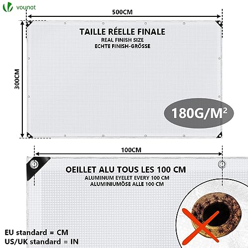 VOUNOT Telo Impermeabile Esterno 3x5m, Telone Occhiellato Impermeabile Rinforzato PE 180 g/m², Telo Protettivo Multiuso per Barche, Legno, Piscina, Mobili da giardino, Auto, Bianco