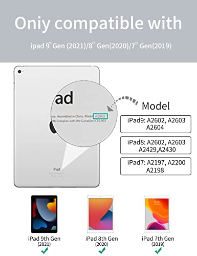 Perfetta compatibilità: progettato per iPad da 10,2" di 9a generazione 2021 (numero di modello: A2602 A2603 A2604 A2605), iPad di 8a generazione 2020 (numero di modello: A2270 A2428 A2429 A2430) / iPad 7. generazione 20122019 (numero di modello: A2197 A2198 A2200). Si prega di controllare il numero di modello del vostro iPad prima dell'acquisto. Non si adatta ad altri modelli di iPad.
