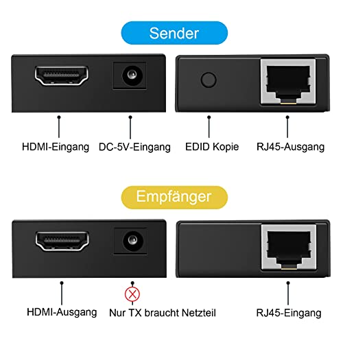 【Technologie POC】 Extender HDMI Alimentazione monofacciale. L'extender HDMI Extender la tecnologia di alimentazione monofacciale (POC). Il ripetitore HDMI deve essere collegato solo all'alimentazione dell'estremità TX, mentre l'estremità RX può funzionare senza collegamento all'alimentazione. Utilizza un'alimentazione a 5 V, sicura e affidabile.