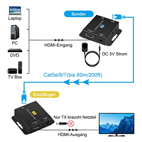 【Trasmissione HDMI senza perdite】HDMI Extender via Cat5e / Cat6 ha La risoluzione più alta supporta 1920x1200 @ 60Hz (sotto 1080p) e i formati audio sono supportati: DTS / DSD, trasmissione senza perdite e senza ritardo del segnale.