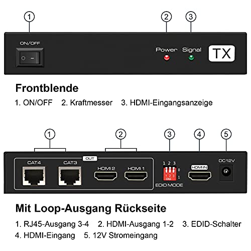 【HDMI Extender Splitter】HDMI Extender Splitter può dividere un segnale HDMI in due segnali identici e farli passare fino a 50 m sul cavo CAT6 con due display locali Loop-Out.