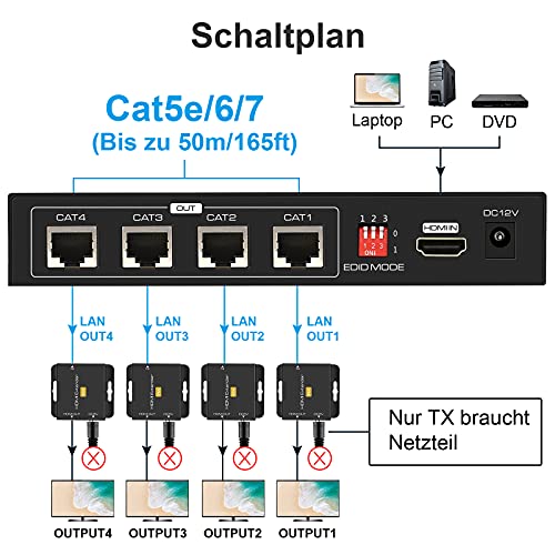 【HDMI Extender Splitter 1 in 4 out】Lo HDMI Extender Splitter è in grado di dividere un segnale HDMI in quattro segnali identici e di farli passare fino a 50 m su cavo CAT6, ideale come extender audio/video a lunga portata.