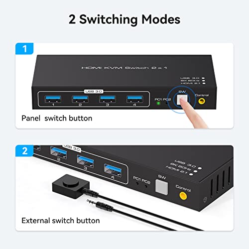 VPFET KVM Switch HDMI 2 Porte 4k120HZ 8K60HZ KVM Switcher per 2 Computer Condividi 1 Monitor e 4 USB 3.0 Supporto del Controllo da tavolo Include 2 cavi USB 3.0 e Adattatori di Alimentazione