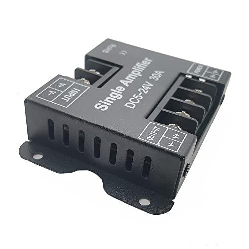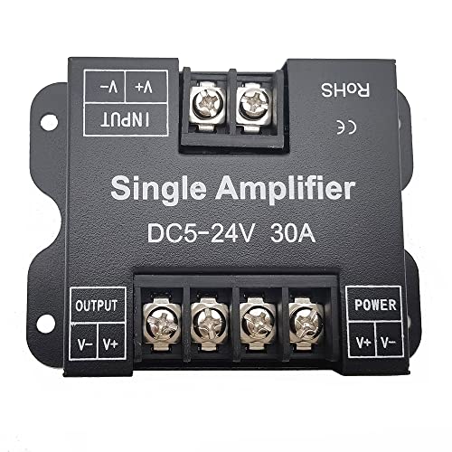 Amplificatore LED DC 5V/12V/24V. La corrente di carico massima è di 30 A, che contribuisce ad un aumento della corrente di uscita. Questo amplificatore di segnale ha un solo canale e consente di estendere facilmente il numero di strisce LED e moduli flessibili. (Nota: si applica quando la potenza di carico supera la potenza di uscita massima del regolatore. Il numero di amplificatori dipende dal carico massimo del prodotto LED).