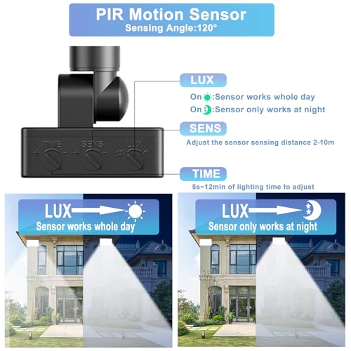 【Tre Modalità Di Induzione】il faretto led da esterno è dotato di un preciso sensore di movimento umano, che copre su e giù di 180° e sinistra e destra di 360°e la distanza di rilevamento è di 3-5M Allo stesso tempo, faretto led da esterno con sensore di movimento ha tre modalità di induzione: TIME (5S-12 minuti), Sens (2-10M), LUX (lavoro diurno o notturno), È possibile regolare il metodo di illuminazione in base alle esigenze effettive per migliorare la comodità dell'uso
