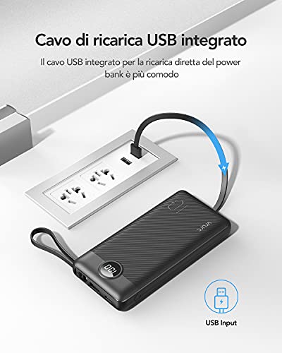 ⚡【Powerbank con 4 cavi integrati】Nessun cavo aggiuntivo necessario!I cavi di ingresso USB e di tipo C integrati consentono di ricaricare il power bank in qualsiasi momento. I cavi di uscita USB e Micro sono compatibili con la maggior parte dei telefoni.che ti consentiranno di ricaricare 4 dispositivi contemporaneamente.