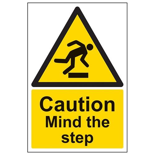 VSafety 63013AU-S - Segnale di avvertimento"Caution Mind The Step", autoadesivo, verticale, 200 mm x 300 mm, nero/giallo