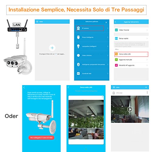 Facile da configurare,tecnologia P2P, telecamera estremamente facile da collegare al telefono o al tablet, collega il cavo di alimentazione e imposta la rete tramite iphone o smartphone Android usando l'app "Eye4"