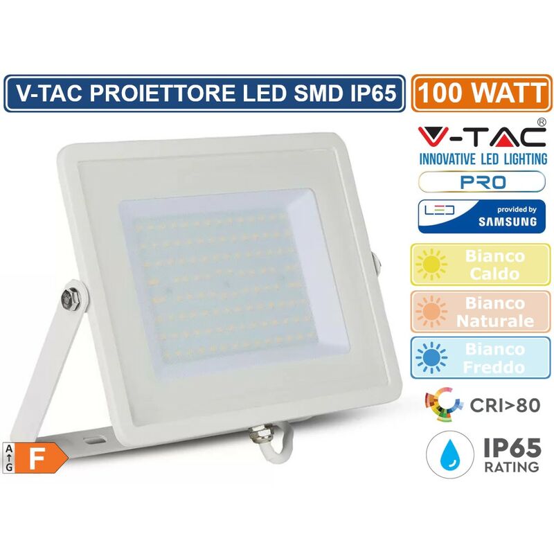 V-Tac Pro VT-100 è un faro LED con potenza di 100W, tecnologia LED Samsung SMD, corpo sottile in alluminio pressofuso di colore bianco e copertura satinata. Con fascio luminoso di 100° e flusso luminoso di 8200 lm, questo faro ha un rapporto di 82 lm/W . Inoltre, ha un grado di protezione IP65 che lo rende adatto ad un uso esterno, anche sotto la pioggia prolungata. È predisposto per il fissaggio a parete, ed il collegamento alla rete elettrica avviene tramite cavi a saldare. I prodotti V-Tac Pro utilizzano chip LED Samsung di ultima generazione, offrendo così un'affidabilità superiore alla media ed un'efficienza energetica più elevata. Proiettore disponibile con 3 diverse temperature colore: Luce Bianca Calda 3000K (SKU 21415), Bianca Naturale 4000K (SKU 21416) e Bianca Fredda 6500K (SKU 21417). Questo prodotto ha una garanzia di 5 anni. Le dimensioni di questo proiettore LED sono: 291 x 240 x 30 mm.
